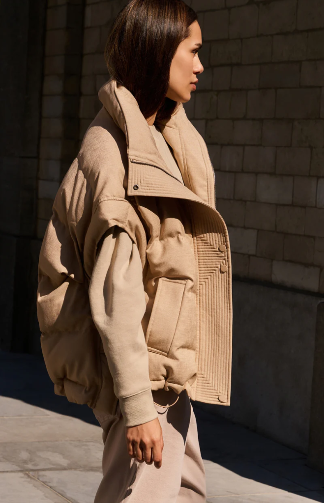 Deze oversized bodywarmer is gemaakt van een gladde nylonstof en heeft een gewatteerde afwerking voor extra warmte. Het ontwerp is voorzien van een opstaande kraag, ritssluiting met drukknopen, schuine steekzakken en zijsplitten met drukknoopsluiting. De achterzijde is iets langer dan de voorzijde voor een moderne, ronde zoom. De grafische stiksels op de sluiting geven dit item een verfijnd detail. Ideaal voor gelaagde looks in het tussenseizoen.