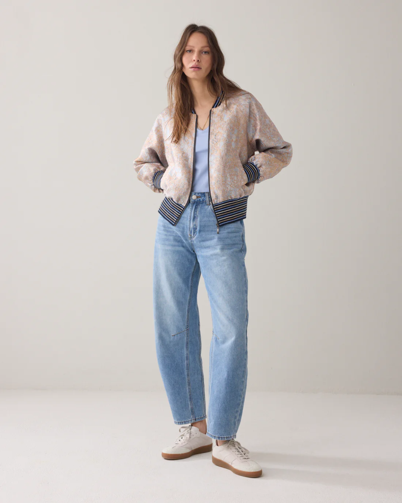 Bomberjasje van jacquard met gouden accenten. Het jasje heeft raglanmouwen, een brede gestreepte boord aan de onderkant en manchetten, en is afgewerkt met een contrastvoering.