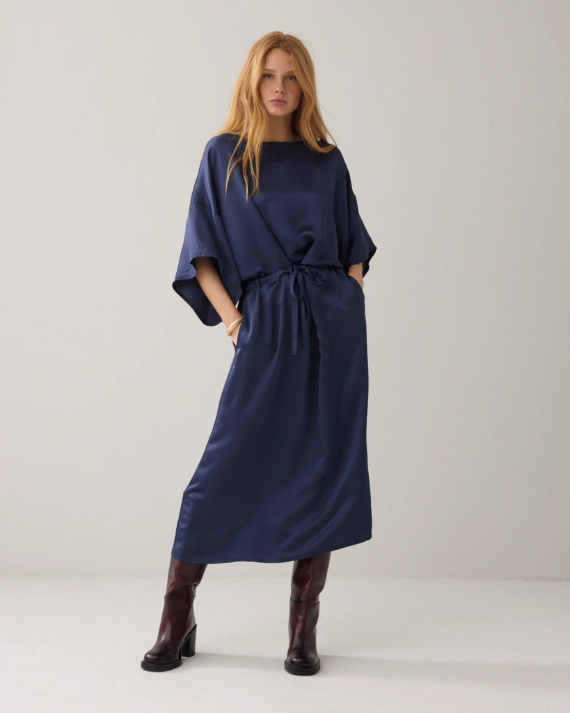 Jurk van soepelvallende heavy silky kwaliteit met een lichte glans. De jurk heeft een boothals met afgebiesde rand, wijde rechte mouwen met verlaagde schoudernaad en een aangerimpelde taille met strikkoord in een tunnel.