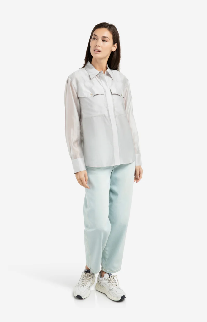 Deze luchtige blouse is gemaakt van een transparante stof en heeft een losse pasvorm. Voorzien van een klassieke kraag, lange mouwen met manchetten en twee borstzakken met klep en knoopsluiting. De verborgen knopenrij zorgt voor een verfijnde uitstraling. Een elegant item dat zich perfect laat combineren in een gelaagde look