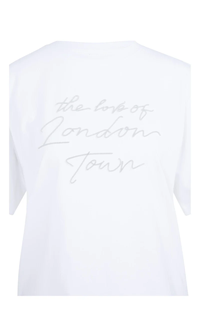 Dit katoenen T-shirt heeft een losse, iets boxy pasvorm en is voorzien van korte, wijde mouwen. Op de borst staat een flockprint met de tekst 'The love of London Town in een zachte finish. De ronde hals en cleane afwerking maken het een casual item met een stijlvolle twist.