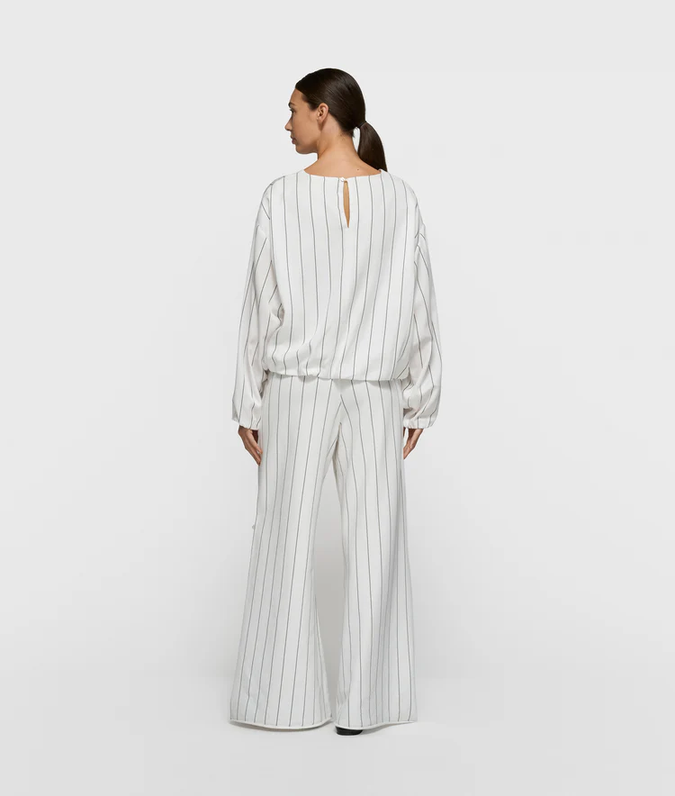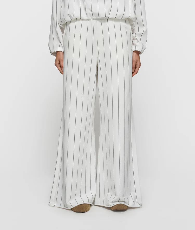 Regular fit pinstripe jogger met wijde pijpen, gemaakt van zacht katoenen babyfleece. Voorzien van een elastische tailleband met riemlussen, steekzakken en een ‘mini stripes’ borduring onder de linker voorzak.