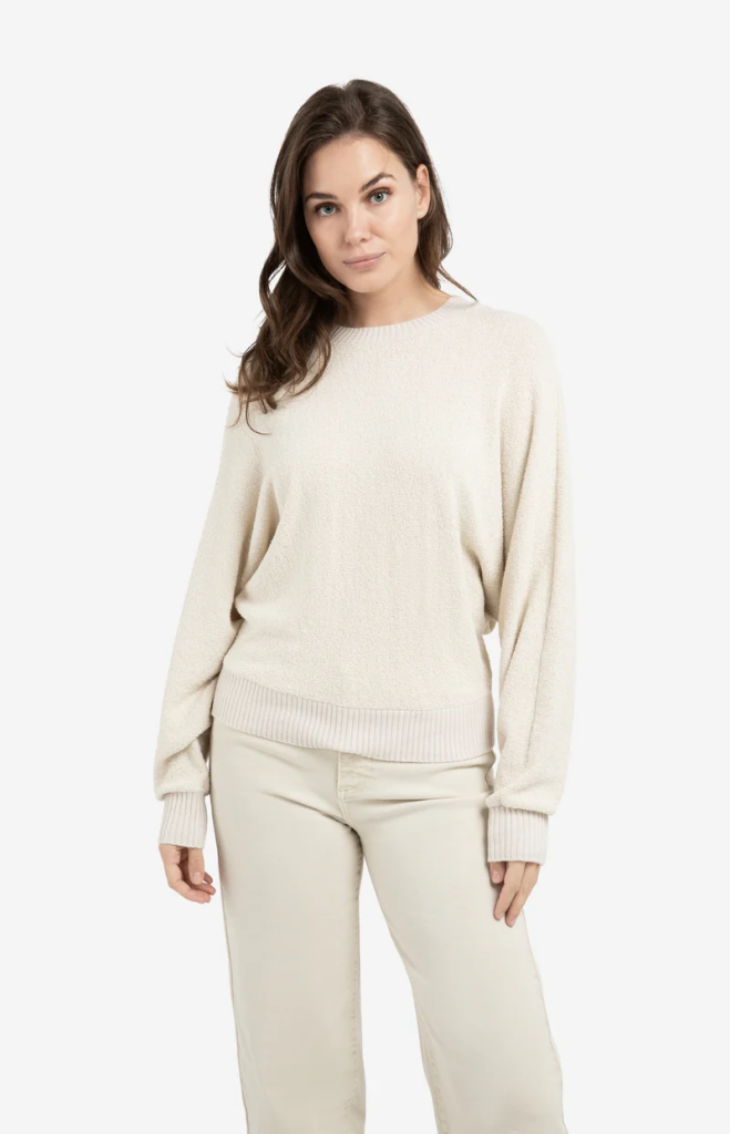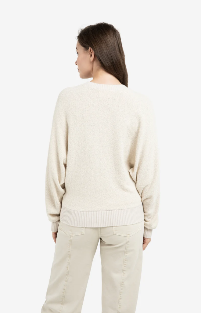 Deze comfortabele trui is ontworpen met lange vleermuismouwen, een ronde hals en contrasterende ribdetails aan hals, zoom en manchetten. De zachte boucléstructuur geeft een moderne twist aan de losse pasvorm. Ideaal voor een nonchalante, elegante look. Combineer met een jeans of rok voor een stijlvolle outfit.