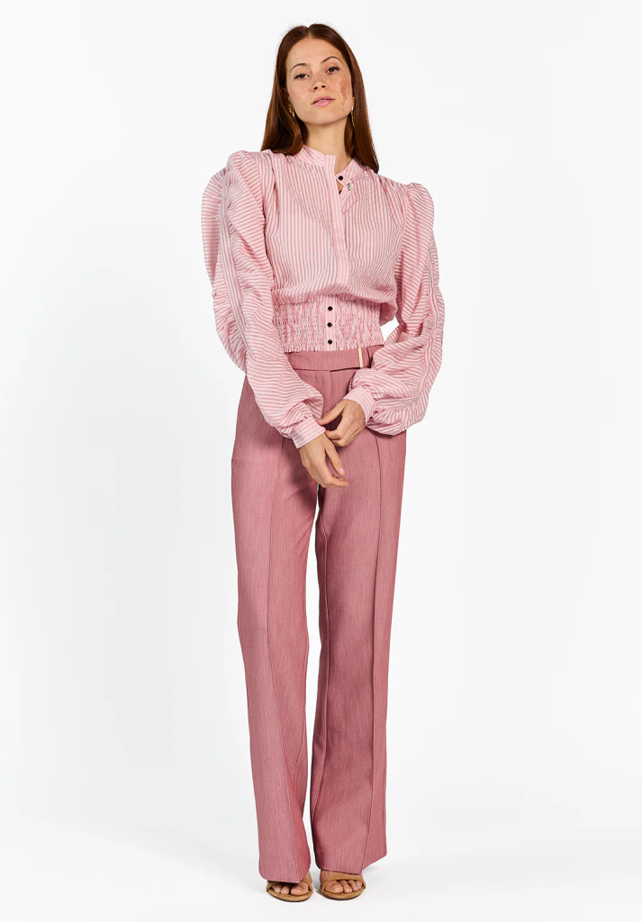 De Beaudine Blouse heeft een vrouwelijke uitstraling met een modern randje. De streepstructuur en volumineuze mouwen geven het silhouet karakter, terwijl de gesmokte taille zorgt voor een flatterende pasvorm. Het lichte materiaal draagt comfortabel en beweegt soepel met je mee. Combineer met de Chantalle Broek voor een gestroomlijnde look die zowel geschikt is voor werk als diner.