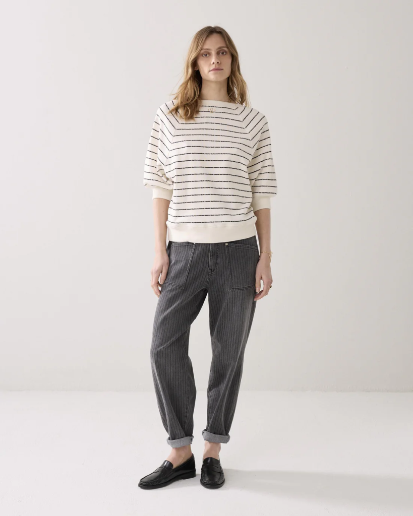 Top van pinstripe soft scuba in een soepele kwaliteit: onze bestseller-stof uit de herfstcollectie. Het model heeft een boxy fit met aangesloten onderkant op de heupen, een polokraag met klein splitje en halflange mouwen met off-shoulder pasvorm.