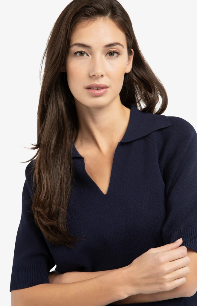 Deze verfijnde trui is gemaakt van een zachte, gebreide stof en heeft een open V-hals met een elegante kraag. De korte mouwen en normale pasvorm zorgen voor een comfortabele, luchtige look. Afgewerkt met ribboorden voor een subtiele structuur.