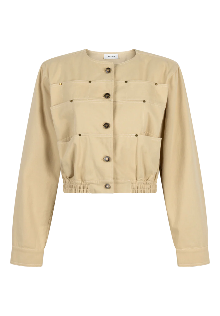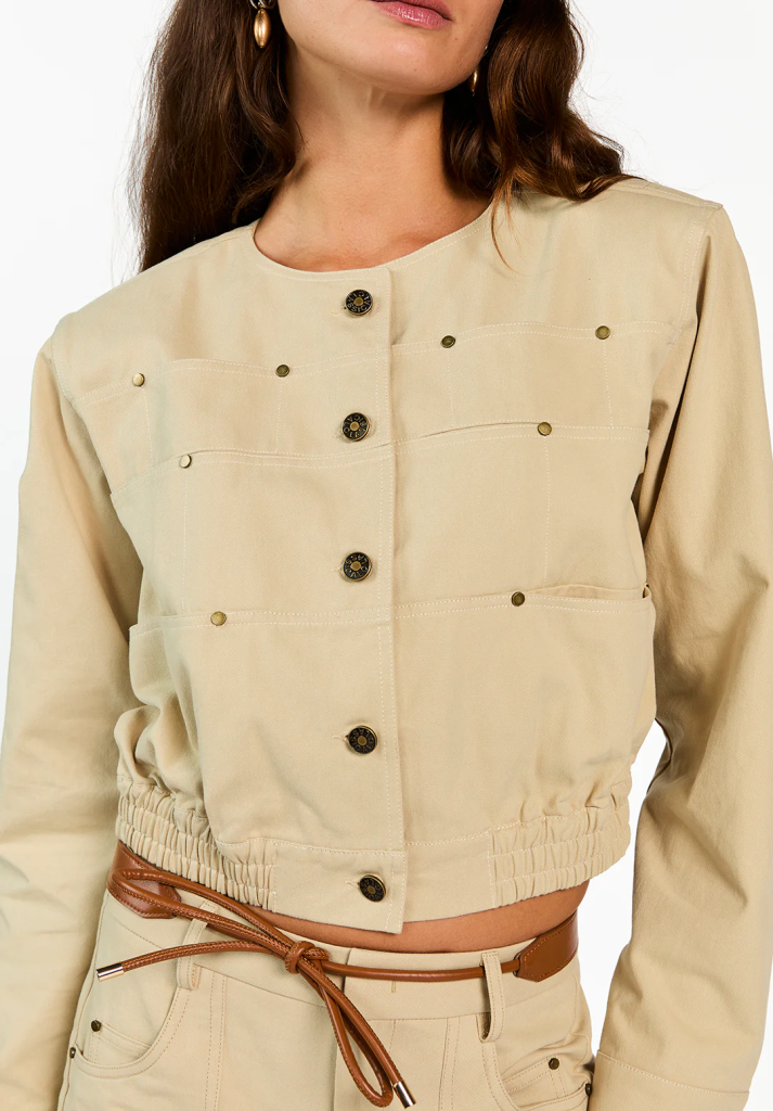 Dit korte jasje is uitgevoerd in een stevige, comfortabele stof en heeft een moderne uitstraling. Het model heeft een ronde hals, knoopsluiting en subtiele metalen studs op het voorpand voor een verfijnd detail. De elastische zoom zorgt voor een aansluitende pasvorm. Een veelzijdig item dat zowel casual als gekleed te dragen is.