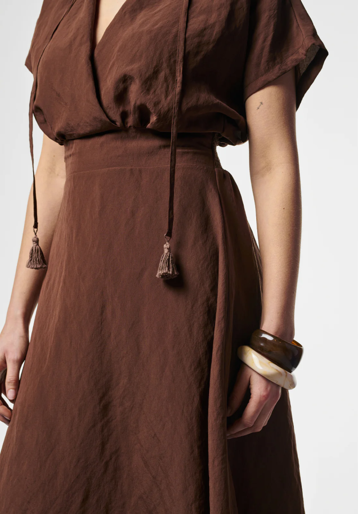 Jurk Serra is uitgevoerd met een overslaghals en een brede tailleband die het silhouet benadrukt. De midi-lengte rok valt soepel en beweegt licht mee. De strikdetails geven een subtiel accent aan het ontwerp.