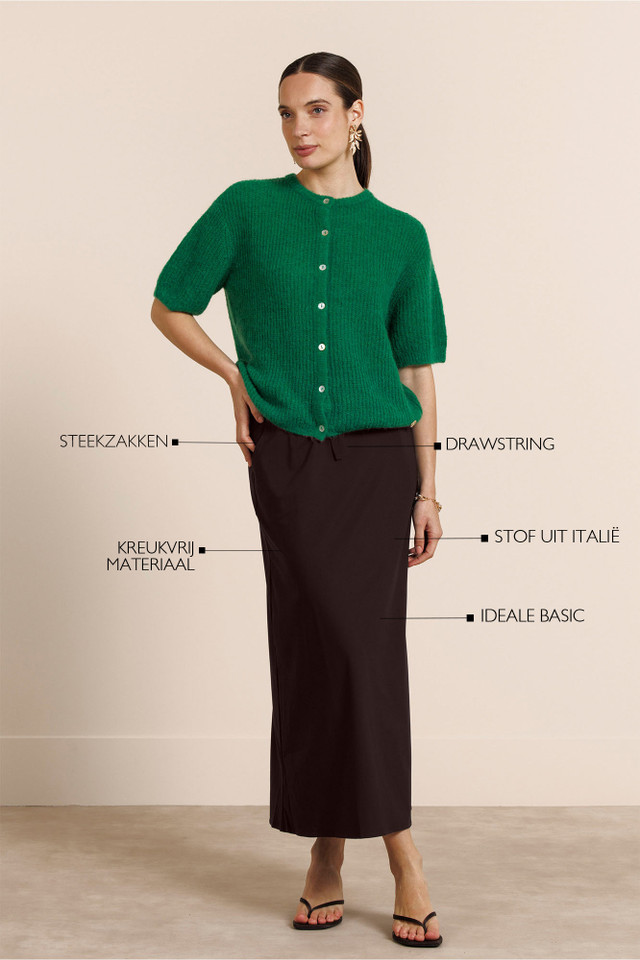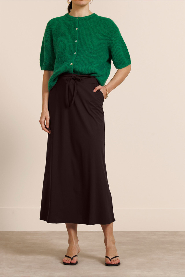 De Chloe skirt van Studio Anneloes is een elegante midi rok in de kleur Espresso. De comfortabele Medium Travelstof, elastische tailleband met drawstring en praktische steekzakken maken dit item ideaal voor elke dag. Een veelzijdige basic die moeiteloos stijl en comfort combineert.