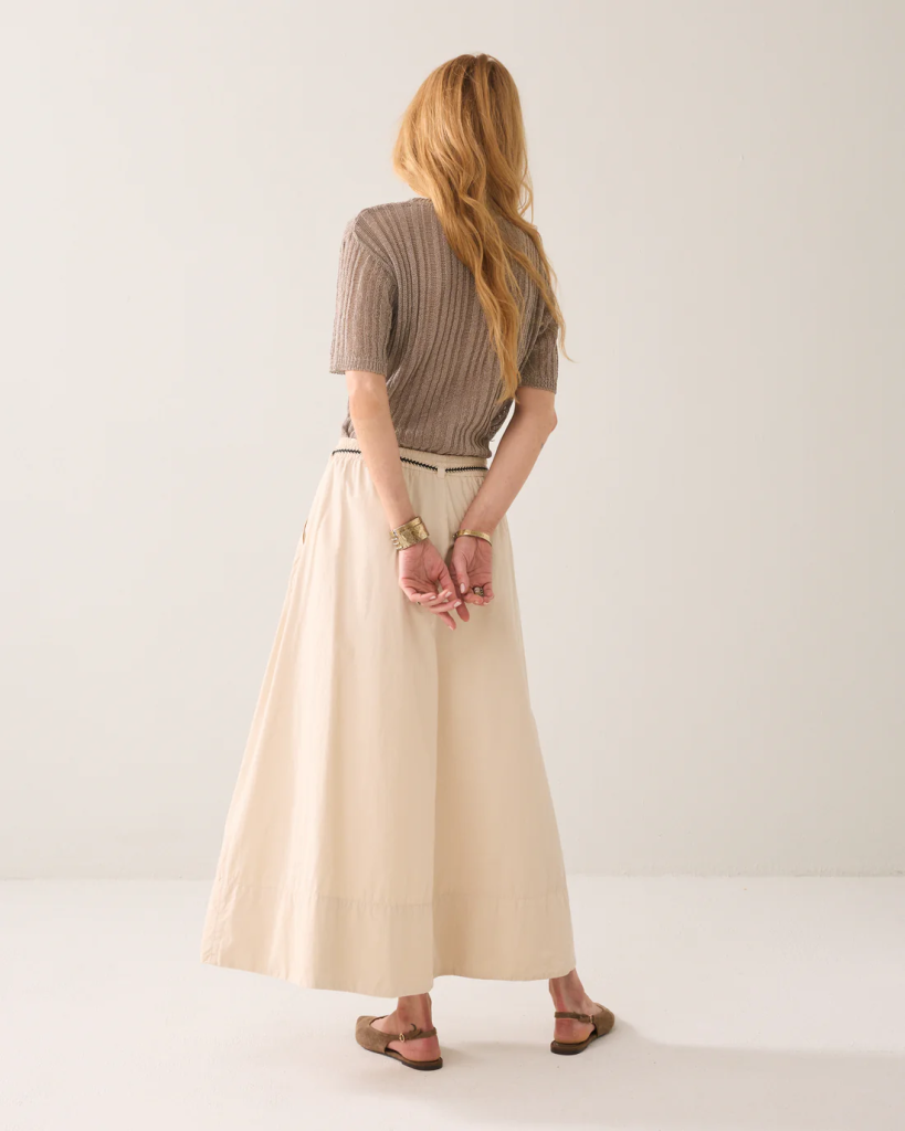 Rok in een canvas kwaliteit met een wijduitlopende pasvorm en een lengte tot op de kuit. Het model heeft chinozakken, een elastische tailleband en een decoratief koordje.