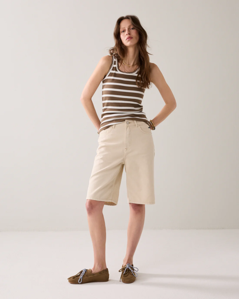 Denim jorts in een stone wassing met een rechte pijp en een lengte tot op de knie. De broek heeft een mid waist en sluit aangesloten aan op de heupen.