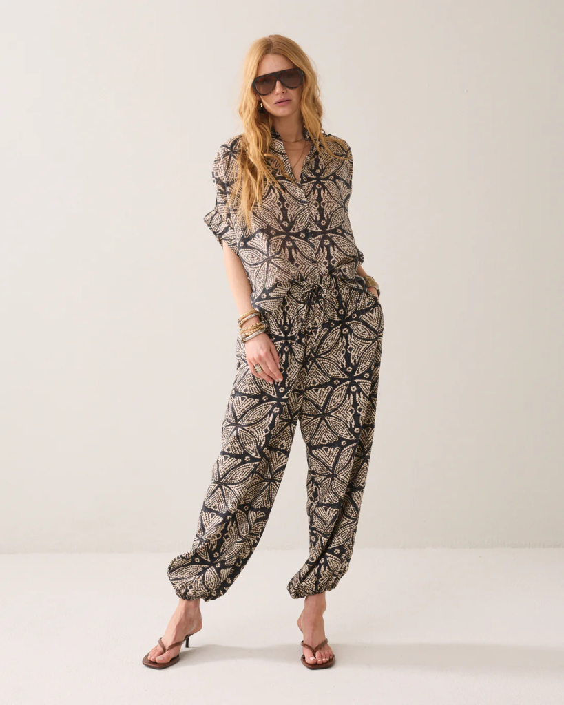 Onze repeat van afgelopen winter: de wear-your-way blouse, maar dan met korte mouwtjes. De korte knoopsluiting en hoge splitten maken het mogelijk om de blouse op verschillende manieren te dragen: losvallend als blouse voor een relaxte look of aan de voorkant gestrikt voor een feminine shape. De blouse heeft opvallende print die uniek is voor ieder item.