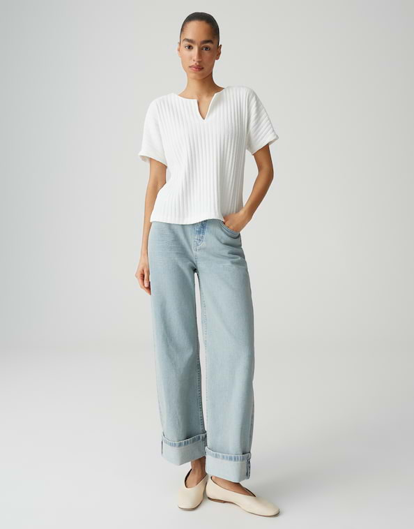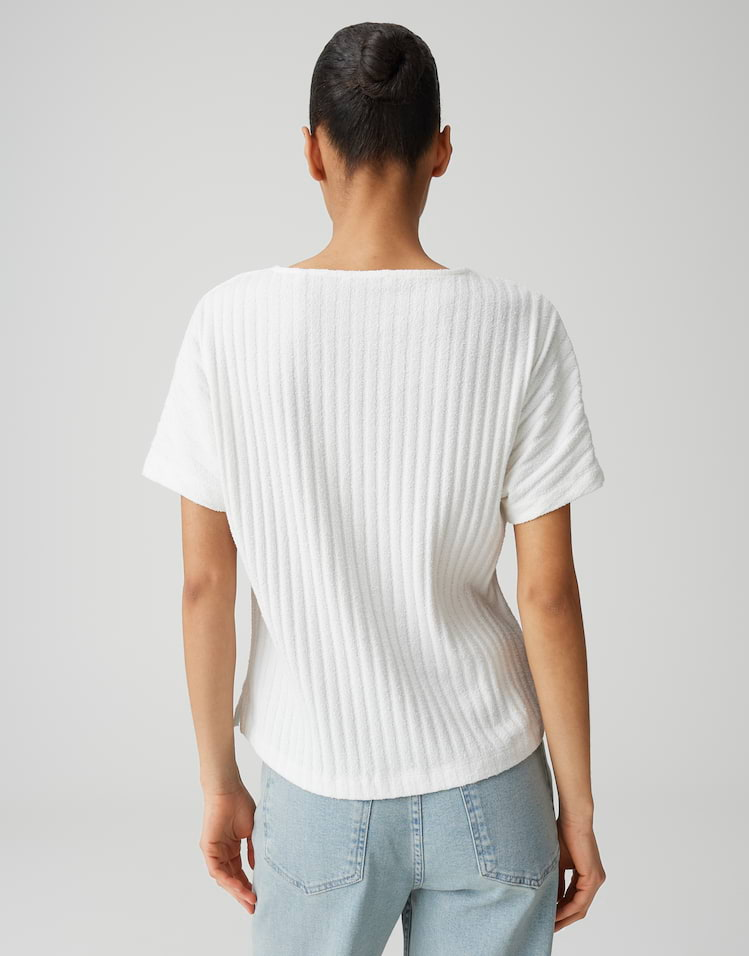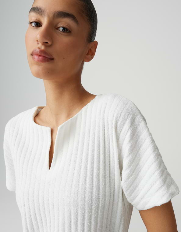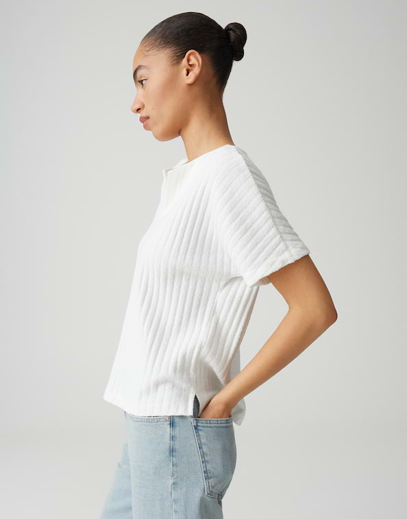 Opvallende ribbels ontmoeten een zacht, bijna badstofachtig oppervlak, mogelijk gemaakt door het licht geruwde Frizzy-garen, dat het SOMBRI-shirt zijn speciale gevoel geeft. Met een boxy snit en geaccentueerd met een splitdetail, heeft het shirt een bewust minimalistische maar allesbehalve alledaagse look.
