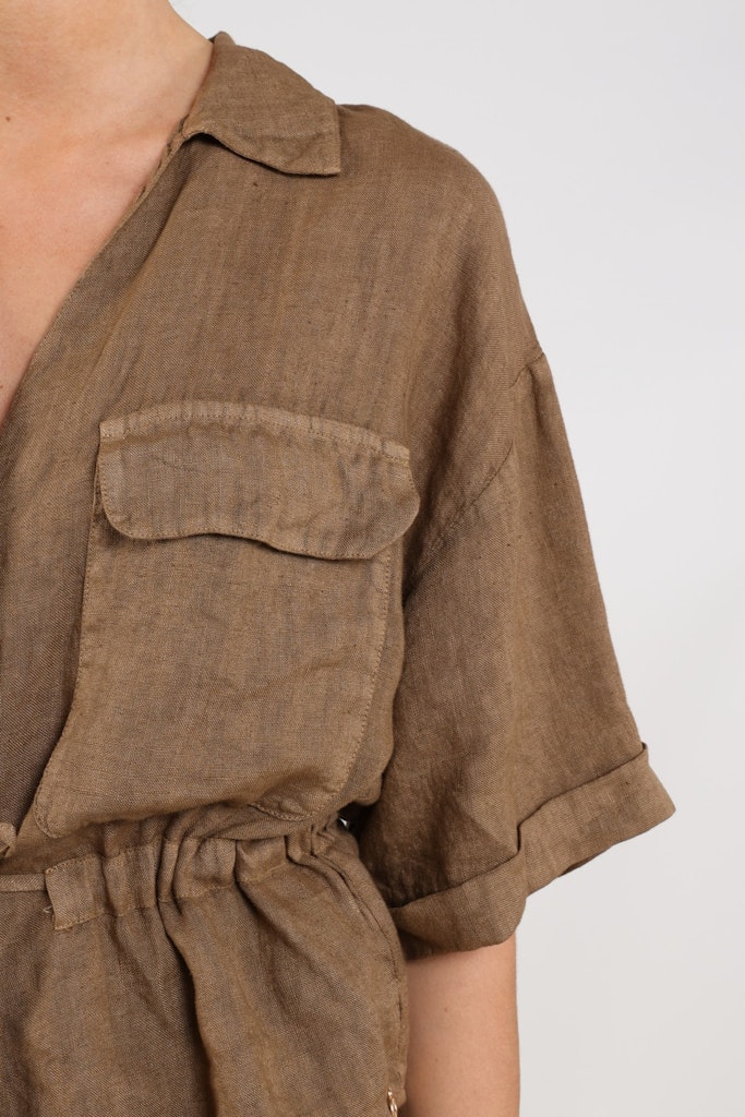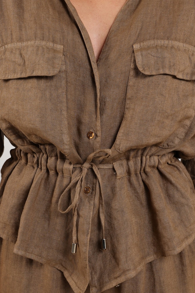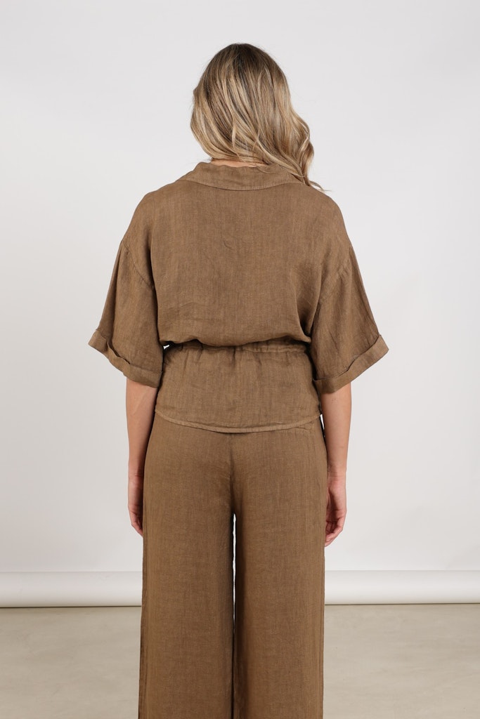 Voor een frisse en natuurlijke voorjaarslook is deze blouse van Nukus een prachtige keuze. De Elma blouse in de kleur fango heeft een luchtige en tijdloze uitstraling dankzij het gebruik van 100% linnen. Het lichte materiaal draagt heerlijk comfortabel en is perfect voor warmere dagen. Met het subtiele taillekoord kun je de blouse mooi tailleren, waardoor een vrouwelijk silhouet ontstaat. Dit detail geeft het item een speelse en elegante twist. Combineer de blouse met de bijpassende Kelly pants voor een stijlvolle en complete set.