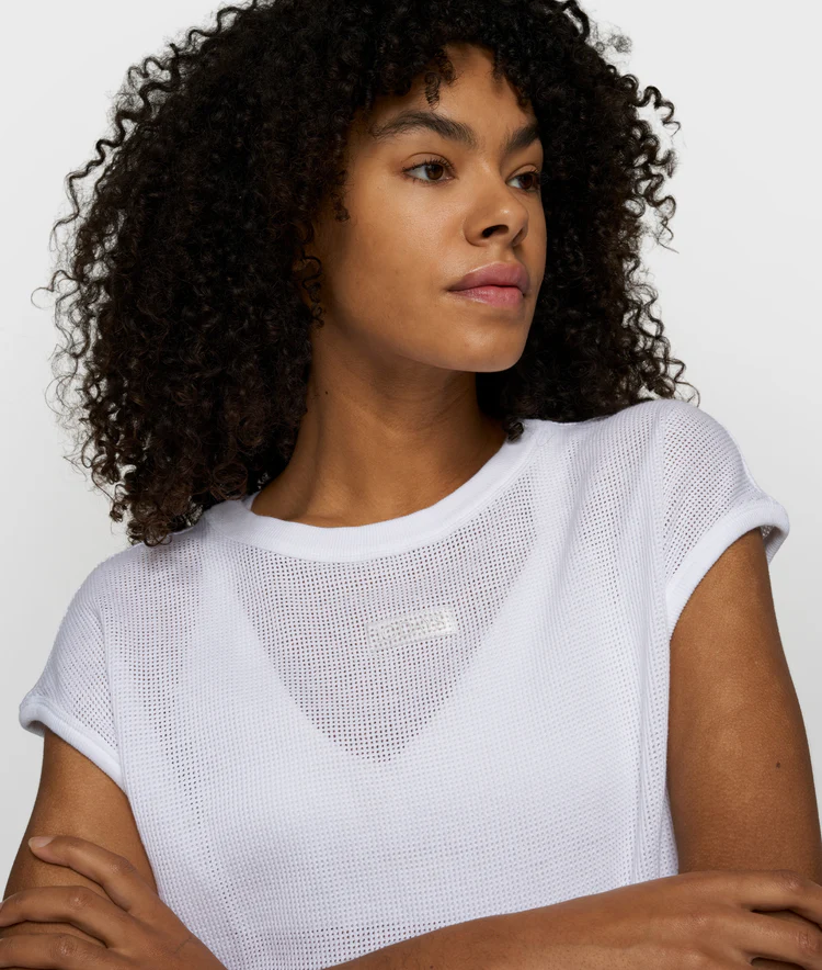 Relaxed fit mouwloos ballon T-shirt, gemaakt van zacht GOTS-gecertificeerd biologisch katoenen mesh. Voorzien van een ribgebreide ronde hals, een geplooide zoom en een klein ‘10DAYS’ label onder de hals.