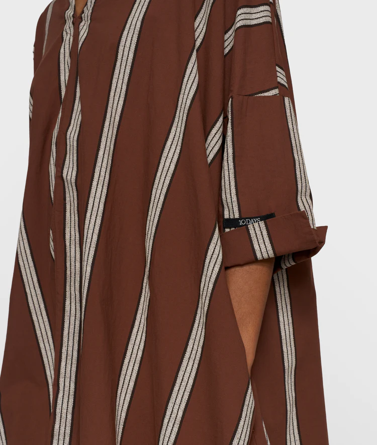 Oversized fit A-lijn tuniek met halflange mouwen, gemaakt van luchtig katoenen paulo poplin met strepen. Voorzien van een opstaande kraag met een split aan de hals, steekzakken, mouwen met manchetafwerking en een ‘10’ monogram borduring boven de linker steekzak.