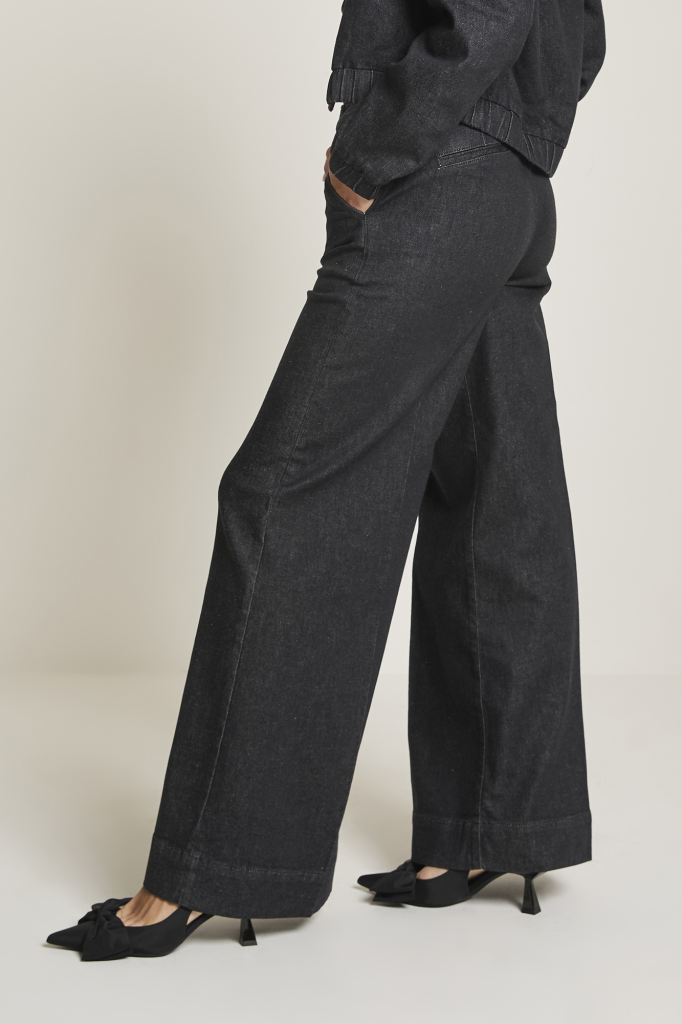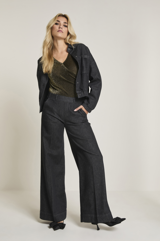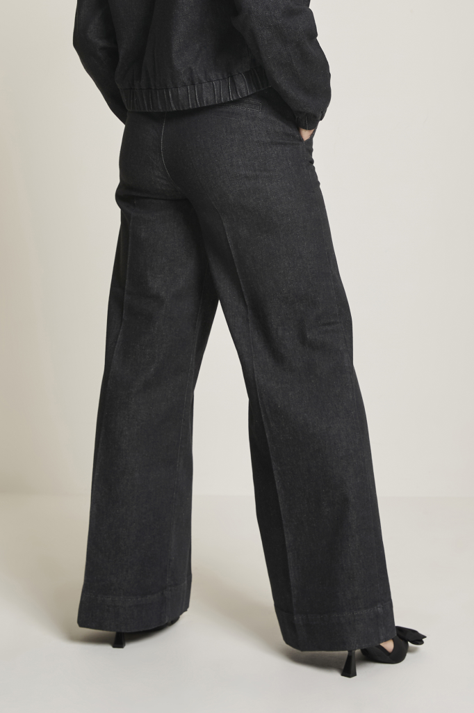 Lizzy heeft een hoge taille. De broek zit wat wijder op de heup en heeft een extra breed uitlopende pijp.