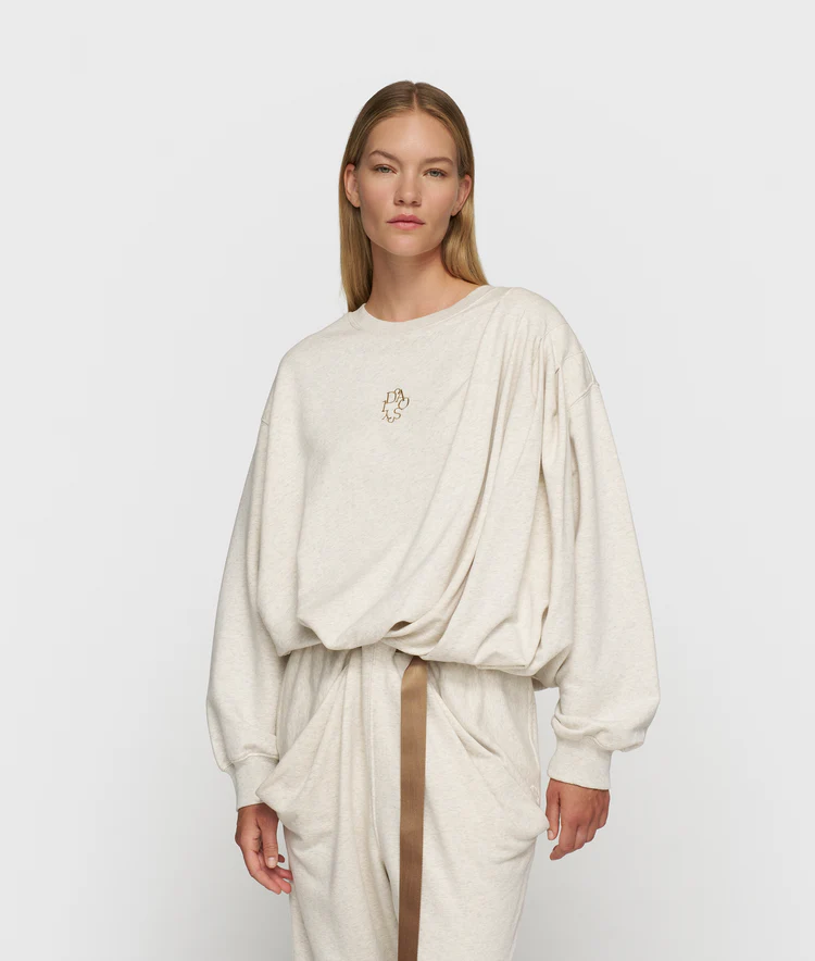 Oversized fit sweater met plooien, gemaakt van zachte light old school katoenen fleece en een zacht jersey binnenvoering. Voorzien van ribgebreide hals en manchetten, lage schouderinzet, ballonshape zoom, plooien van de linkerschouder en een curly '10' borduring op de borst.