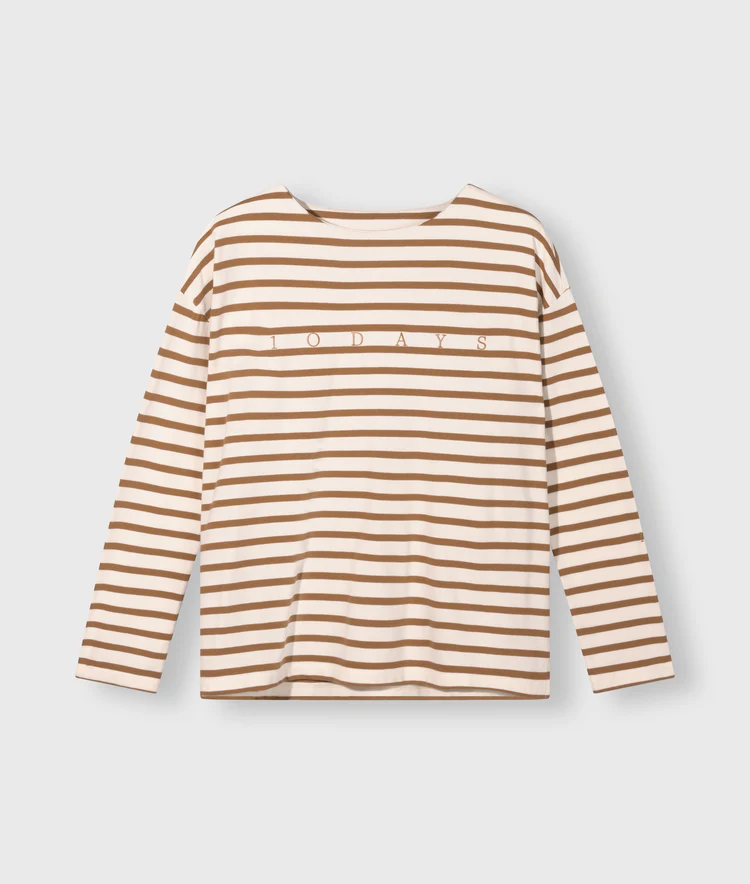 Oversized fit gestreepte top, gemaakt van zacht GOTS-gecertificeerd biologisch katoen. Voorzien van een brede boothals, kleine zijsplitten, lage schouderinzet, een '10DAYS' boxprint op de borst en een '10' monogram borduring op de linkermouw.