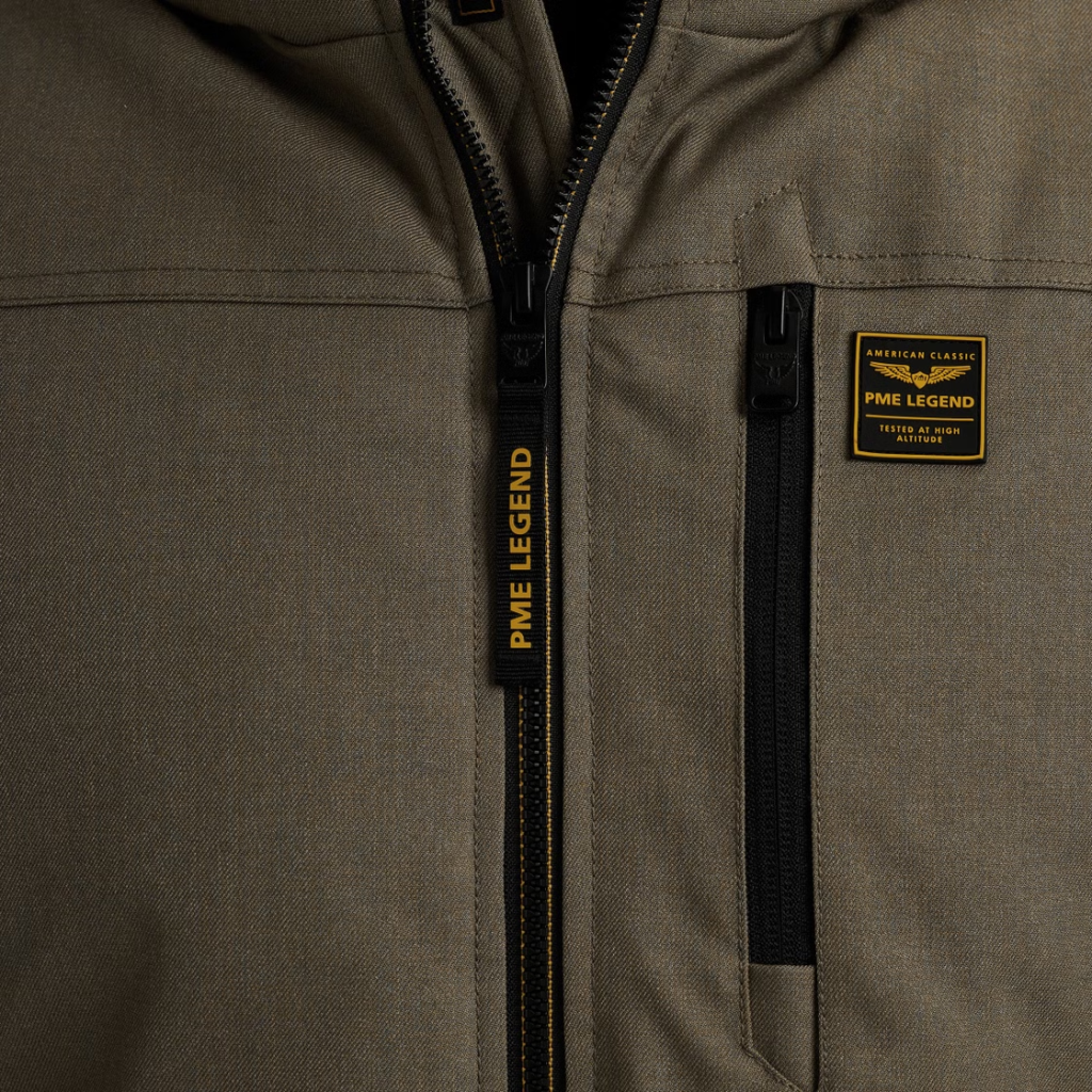 De PME Legend Strator is uitgevoerd in een melange twill met een wollen look. De gecoate achterzijde van de stof maakt van dit model een perfecte all-weather jas. De capuchon is afneembaar en verstelbaar. Ook de cuffs en de heupboord kunnen worden versteld. Deze waterafstotende jas is voorzien van twee zijzakken met drukknopen en fleece voering, een borstzak met rits en een binnenzak met rits. De voering is gequilt in een authentiek hexagoon patroon. De kenmerkende PME Legend details ronden het design af.