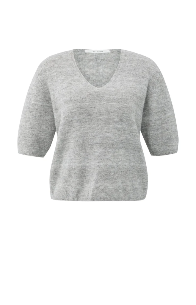 Deze vrouwelijke trui is gemaakt van een zachte gemêleerde garen en heeft korte mouwen, een V-hals en een comfortabele pasvorm. De knopenrij en subtiele split aan de achterkant zorgen voor een speels detail.