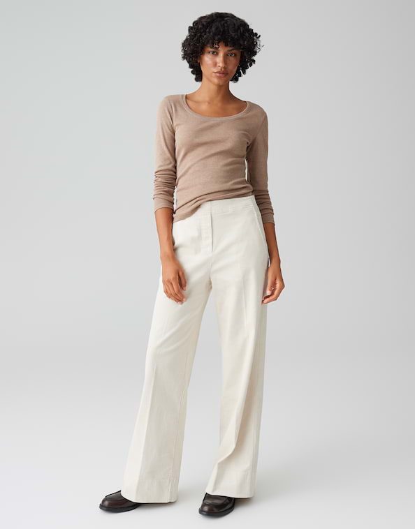 Deze corduroy broek heeft een coole casual look, terwijl de wijde, lange pijpen het figuur flatteren en de elastische tailleband voor extra comfort zorgt. Hij is perfect te combineren met oversized knitwear voor een trendy outfit.