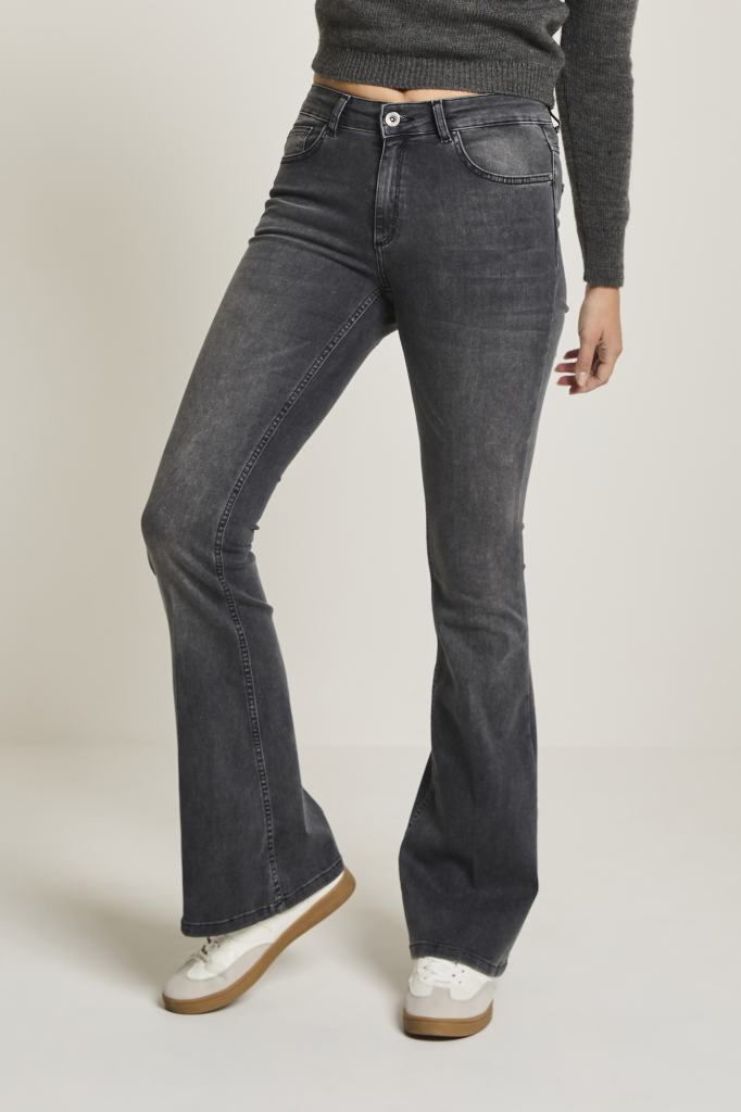 Jade is een broek met een hoge taille en een uitlopende broekspijp. Deze 5-pocketbroek zit bij de bovenbenen aangesloten, vanaf de knie loopt de broekspijp uit. Het is een broek die zowel een vintage uitstraling heeft als een classy. Met hakken maak je hem chic, met sneakers wordt hij meer casual.