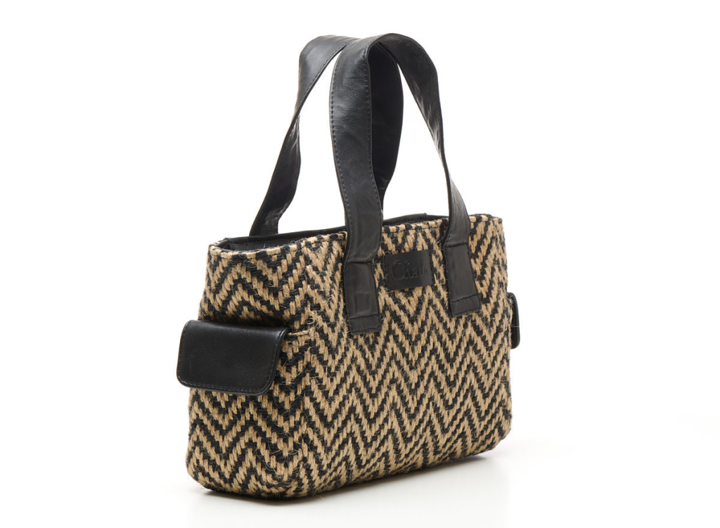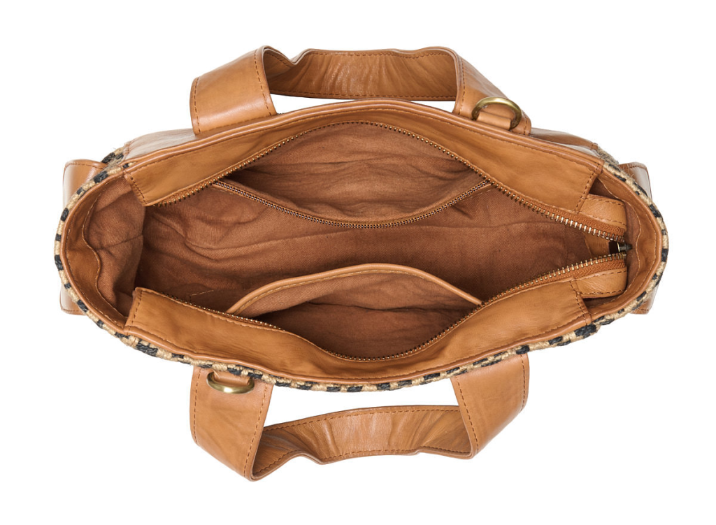 De zijkanten van de tas zijn uitgevoerd in stijlvolle jacquardstof en afgewerkt met leren klepjes. De onderzijde heeft een volledig leren bodem – voor extra stevigheid en een luxe finish.