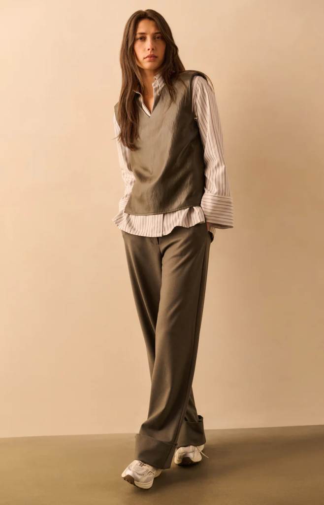 Deze elegante broek is gemaakt van een zachte, gestructureerde geweven stof en is ontworpen met een middelhoge taille en wijde pijpen. De opvallende brede omslagen aan de zoom geven een moderne twist. Afgewerkt met steekzakken, paspelzakken achter en riemlussen