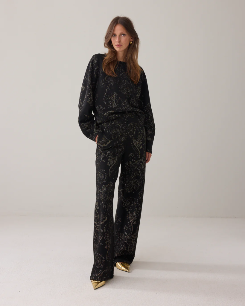Feestelijke top van stevige, foam jersey met ingeweven ornamenten in een subtiele glitter. De trui heeft een cropped boxy fit, ronde hals en aangeknipte ballonmouwen met een naad en plooien voor extra volume.