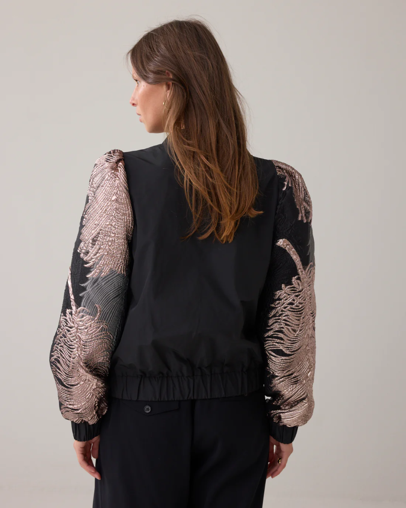 Volledig gevoerd bomberjack met pofmouwen in leaves-jacquard met ingeweven lurex. De body is effen van kleur. Afgewerkt met strookzakken, elastiek aan de onderkant en een metalen rits.