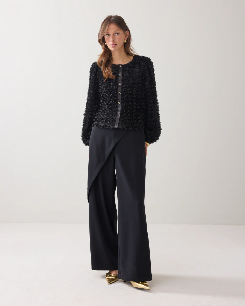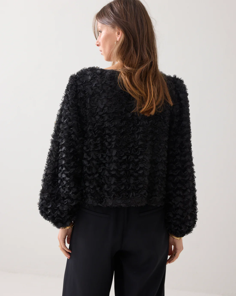 Kort jasje van stretchy flowerfluffy-stof met een boxy fit. Voorzien van een satijnen knooplijst met verschillende fancy knopen. Het jasje is gevoerd met viscose voor een lekker gevoel op de huid en is afgewerkt met een gesmokte satijnen halsboord.