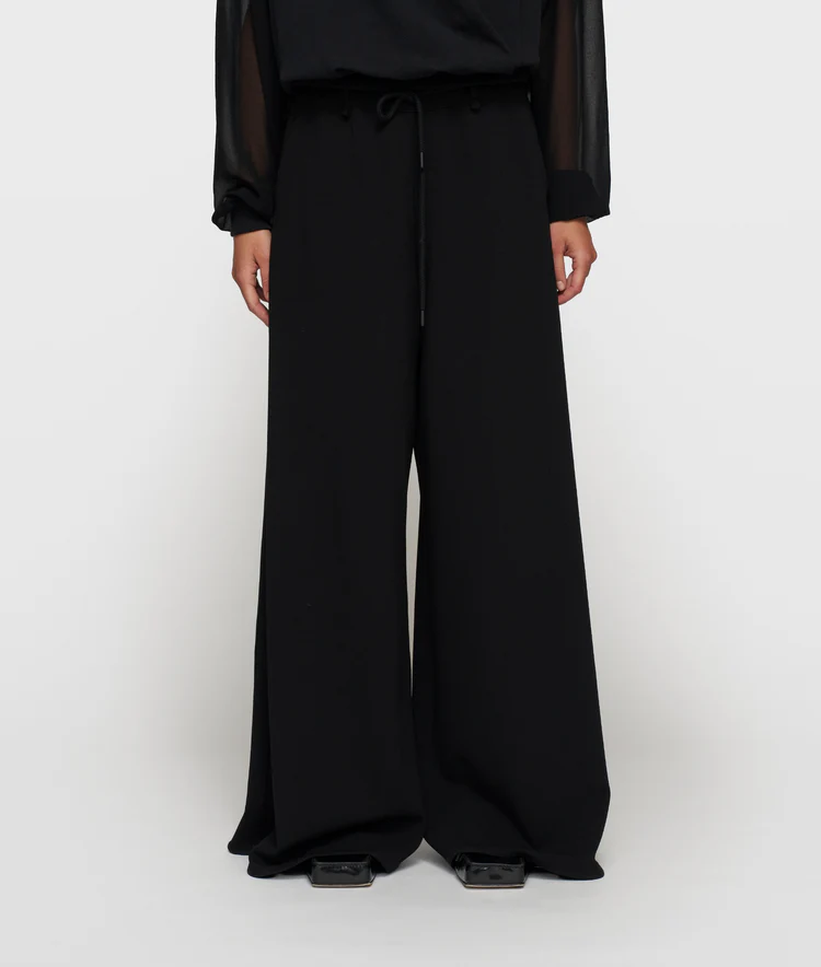 Relaxed fit broek met extra wijde pijpen, gemaakt van zachte stretch crepe. Voorzien van een elastische tailleband met koord en riemlussen, schuine steekzakken, een nep gulp en een '10' monogram borduring onder de linker zak.