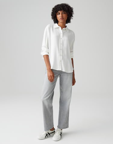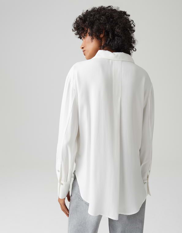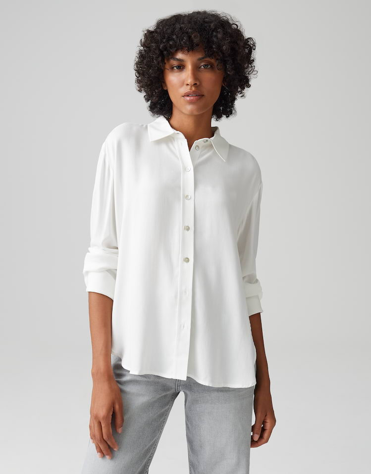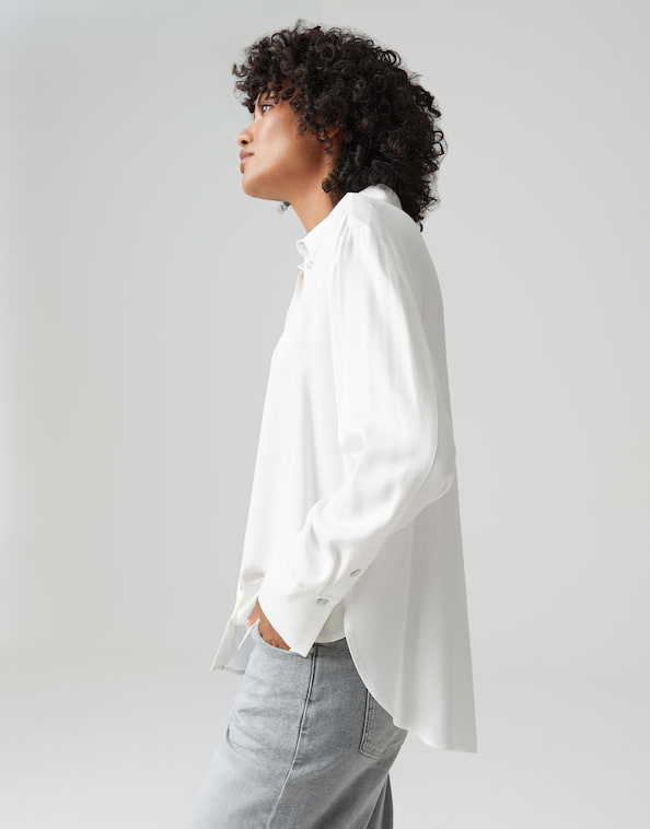 Deze overhemdblouse van fijne keperstof maakt indruk met zijn vloeiende geweven stof en klassieke details. Perfect voor alledaagse zakelijke kleding, maar kan ook stijlvol worden gecombineerd met jeans voor een ontspannen look.