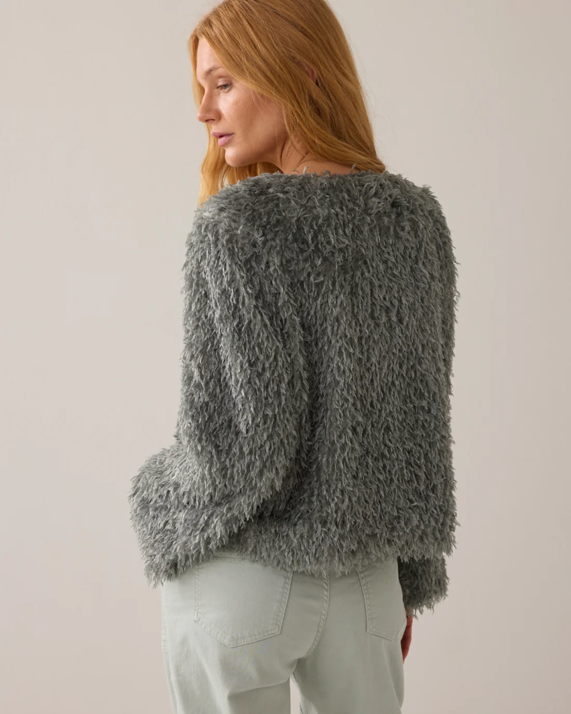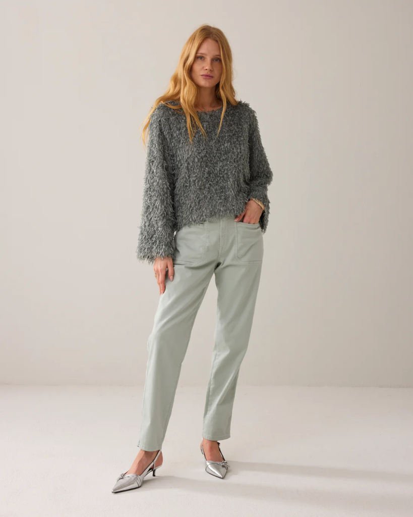 Trui met een fluffy, veerachtige structuur en satijnen voering. De trui heeft een ronde hals, rechte mouwen en een boxy fit.