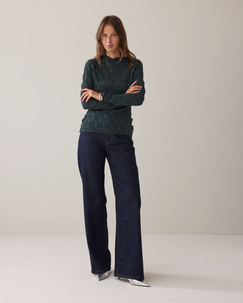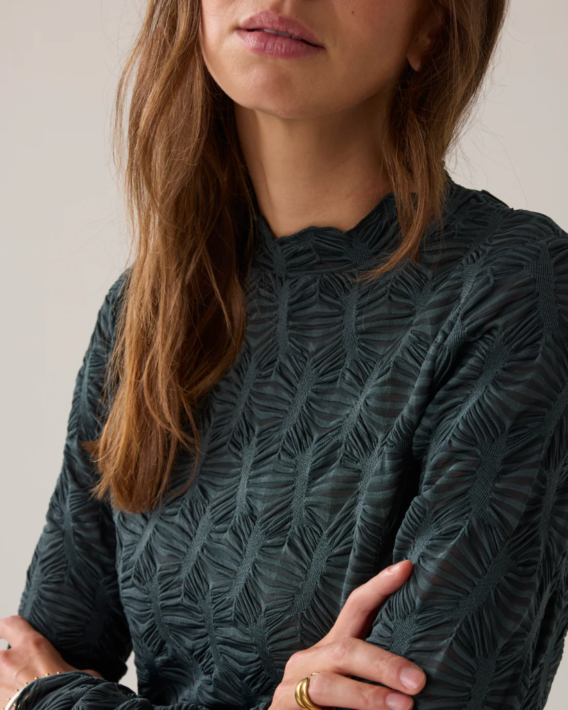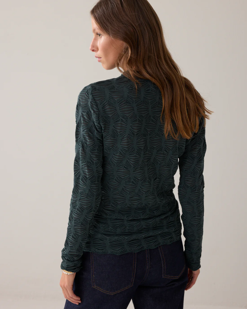 Top van een rekbare, transparante jersey uitgevoerd in een ruitjespatroon. De top heeft lange mouwen, een ronde hals en een aangesloten pasvorm. Alle zomen zijn afgewerkt met fijne babylock-stiksels.