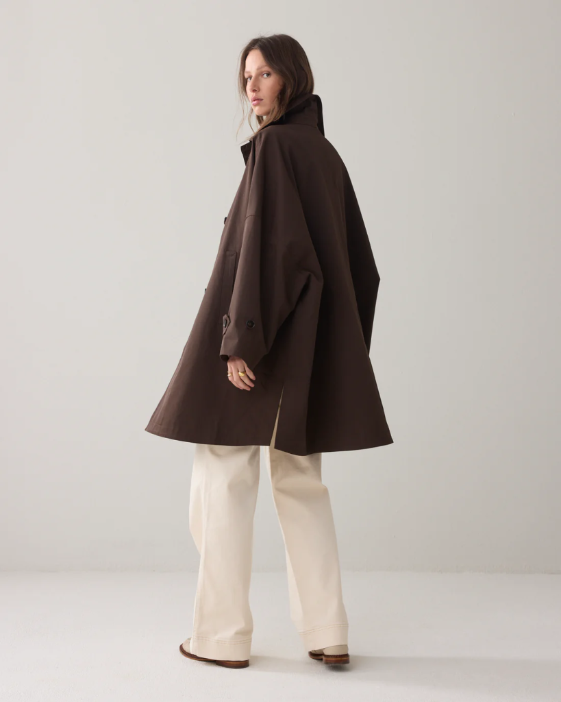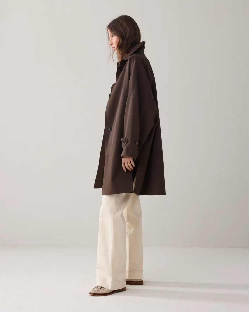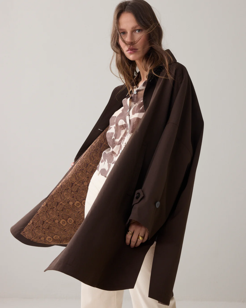 Lange oversized jas - grandpa coat - met verlaagde schoudernaad en splitten aan de zijkant. De jas is gevoerd en heeft een knoopsluiting, verstelbare manchetten met knoopjes en steekzakken.