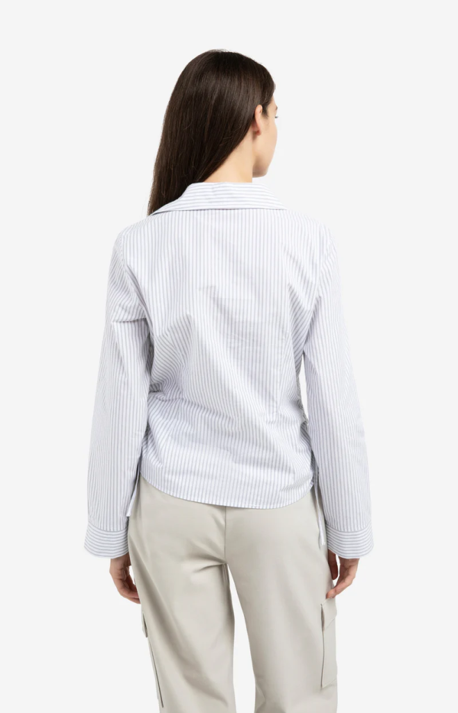 Deze gestreepte blouse heeft een getailleerde pasvorm, klassieke kraag en lange mouwen met brede manchetten. De strikkoorden aan de zijkant zorgen voor een verstelbare taille en een vrouwelijke look. De manchetten met contrasterende streeprichting voegen een verfijnd detail toe.