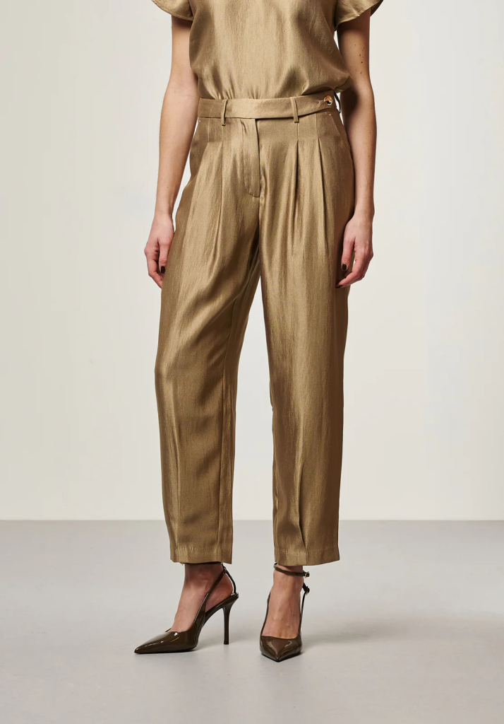 Deze broek heeft een verfijnde, moderne uitstraling met een duidelijke focus op pasvorm. De rechte pijpen geven het ontwerp een cleane, geklede look. De middelhoge taille zorgt voor een comfortabele fit, waardoor de broek geschikt is voor zowel zakelijke outfits als meer casual combinaties. een mooie combinatie met de broek is de Minny top.