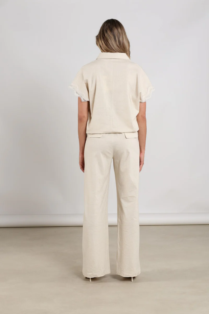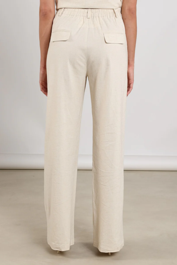 Deze broek in sand is gemaakt van een luchtige mix van viscose en linnen en heeft een op maat gemaakte pasvorm met elastiek aan de achterkant voor optimaal comfort. Mooi te combineren met de Daniel top voor een complete, stijlvolle look voor het voorjaar en de zomer.