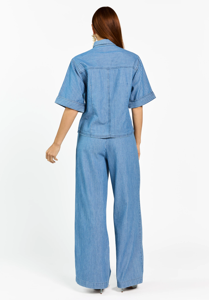 Deze broek is uitgevoerd in een soepele denimstof met een verfijnd streeppatroon. Het model heeft een hoge taille met plooidetails aan de voorzijde en wijde, rechte pijpen voor een elegante pasvorm. De elastische tailleband zorgt voor extra comfort. Goed te combineren met de blouse Serene voor een complete en stijlvolle look.