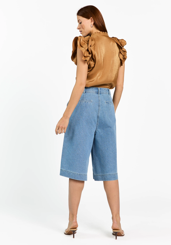 Deze top heeft een elegante uitstraling dankzij de soepelvallende stof met subtiele glans. Het model is afgewerkt met een opstaande kraag en speelse ruches op de schouders, wat zorgt voor een vrouwlijk gevoel. De blinde knoopsluiting aan de voorzijde geeft een nette afwerking.