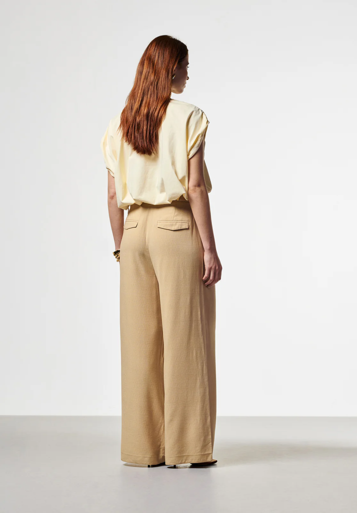Deze broek heeft een elegante en luchtige uitstraling. Het model is hoog in de taille en valt los langs het been, wat zorgt voor een flatterend en comfortabel silhouet. De plooien aan de voorzijde geven extra verfijning, terwijl de elastische tailleband met gespdetail zorgt voor een moderne touch.