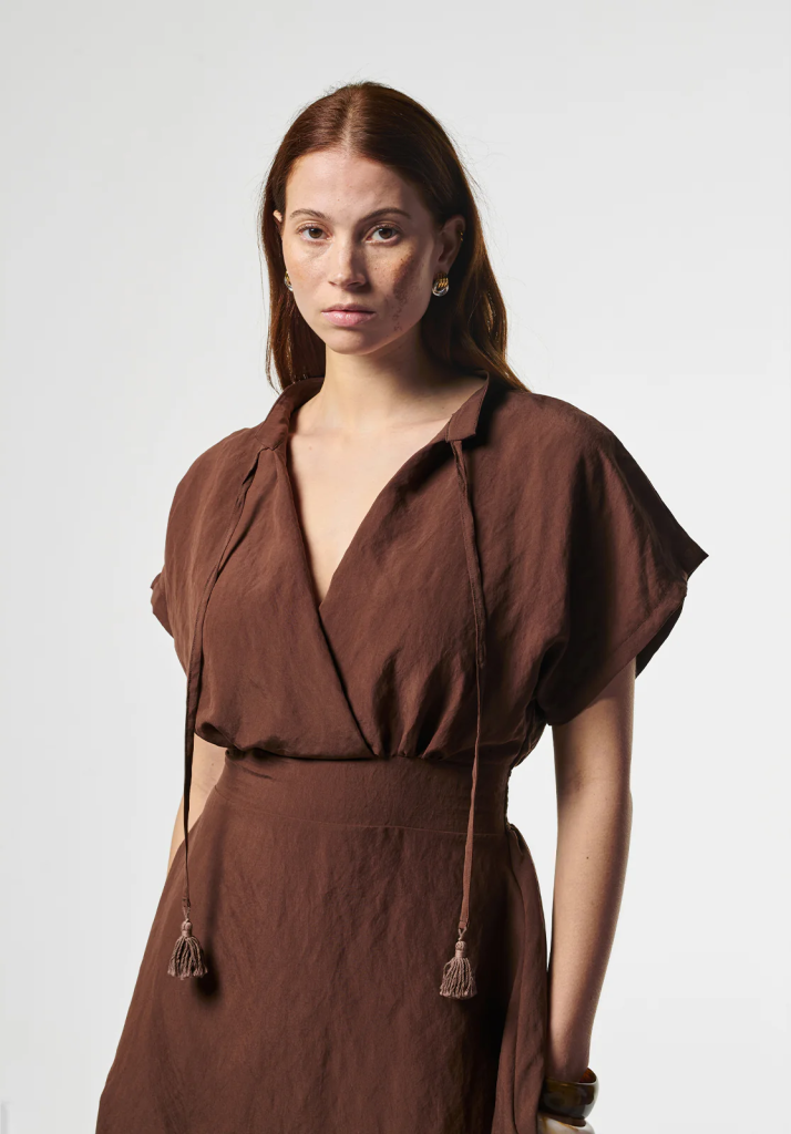 Jurk Serra is uitgevoerd met een overslaghals en een brede tailleband die het silhouet benadrukt. De midi-lengte rok valt soepel en beweegt licht mee. De strikdetails geven een subtiel accent aan het ontwerp.