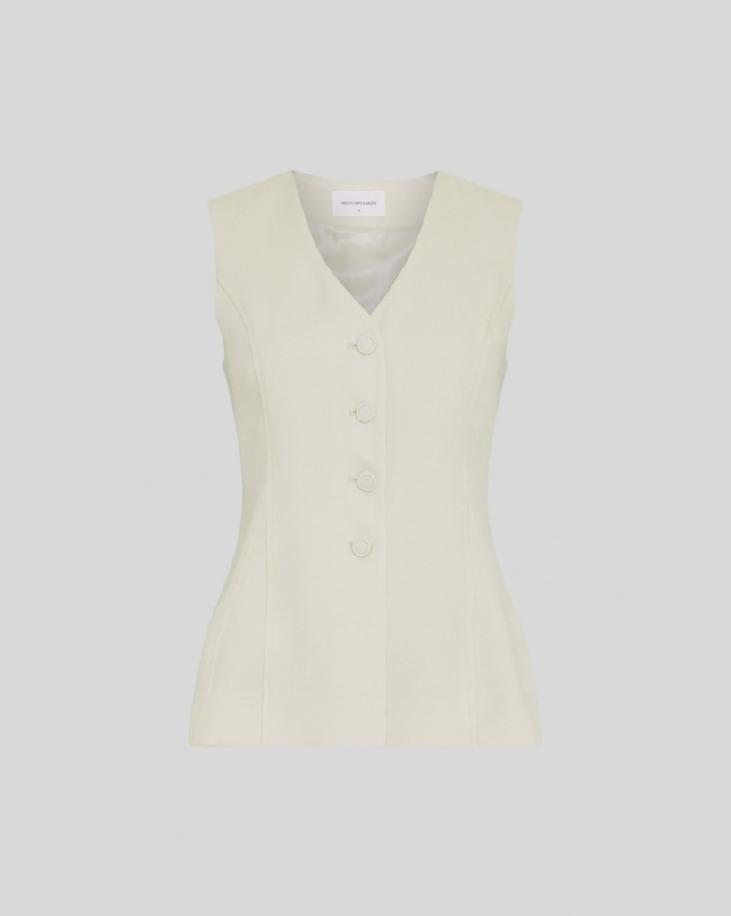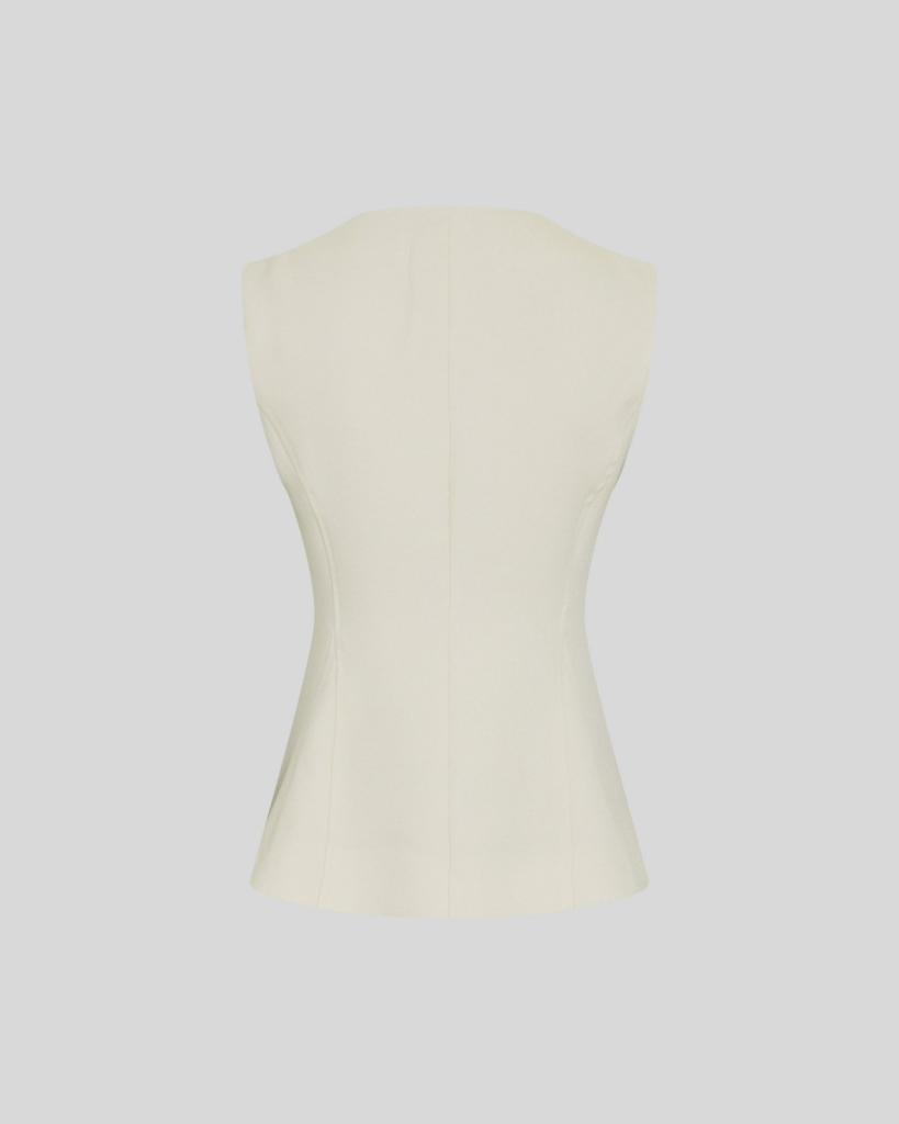 Getailleerd vest met nauwsluitende pasvorm. V-hals en knoopsluiting aan de voorkant. Vormgevende naden.