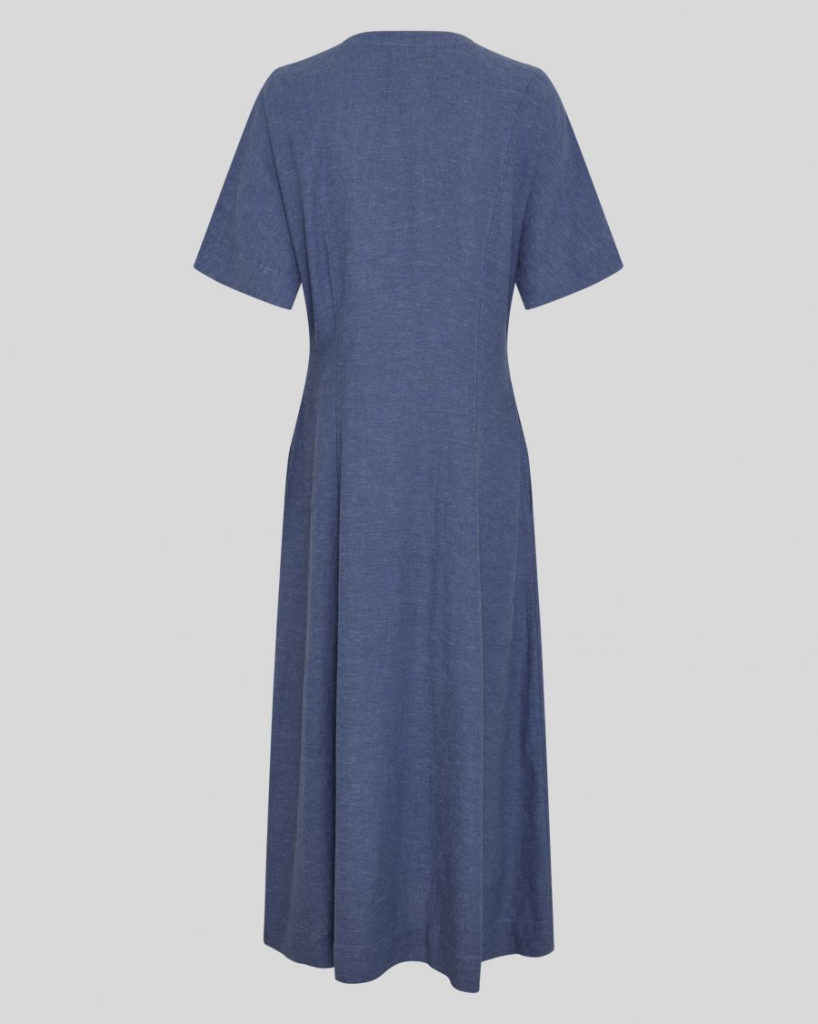 Lange jurk van linnenmix. Ontworpen met een V-hals en een doorlopende knoopsluiting aan de voorkant. Korte mouwen en een licht A-vormig silhouet.