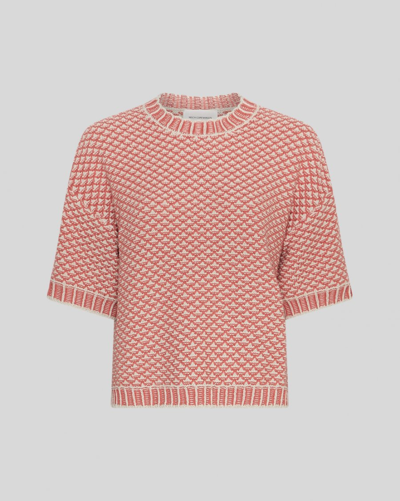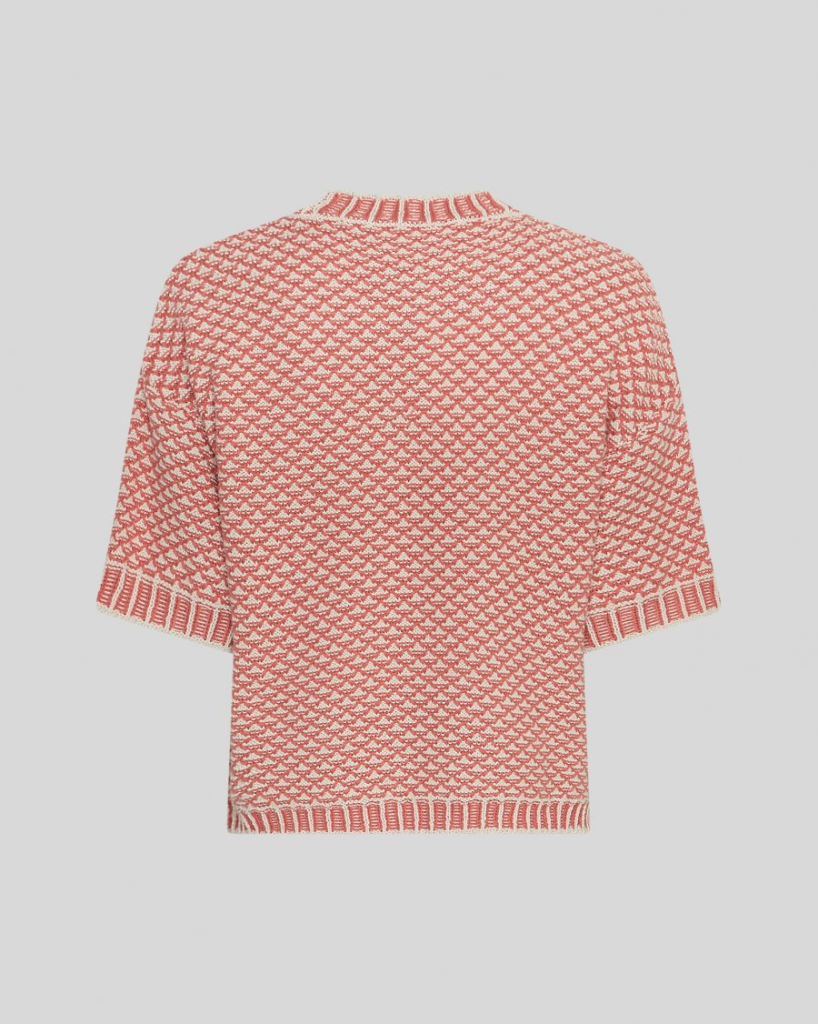 Gebreide trui met een grafisch patroon en comfortabele korte mouwen. Afgewerkt met ribboorden bij de halslijn, mouwen en zoom voor een strakke en moderne look. Een makkelijk te combineren item, geschikt voor zowel casual als gelaagde outfits.