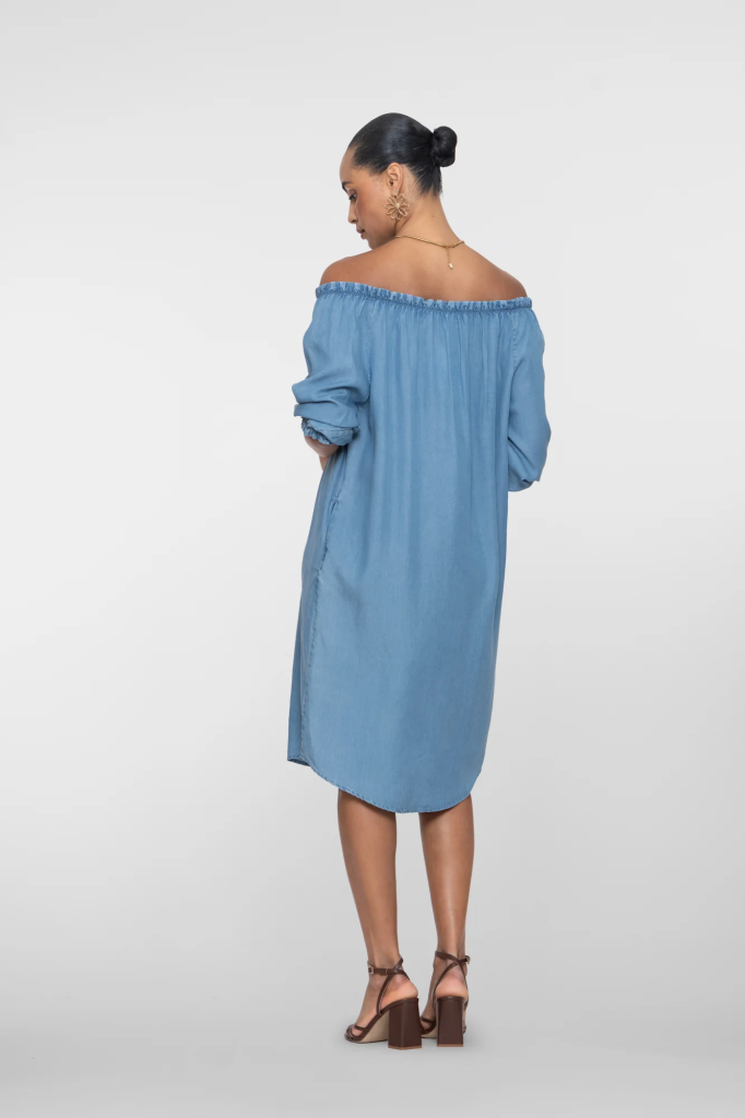 Deze dames jurk is uitgevoerd in soepel lyocell met een zachte denimlook. De elastische off shoulder halslijn geeft het ontwerp een elegante uitstraling en kan zowel recht als off shoulder gedragen worden. De halflange mouwen met elastische manchetten zorgen voor een subtiel volume. Het losvallende model dat over de knie valt, creëert een vloeiend silhouet met een verfijnde, relaxte uitstraling.
