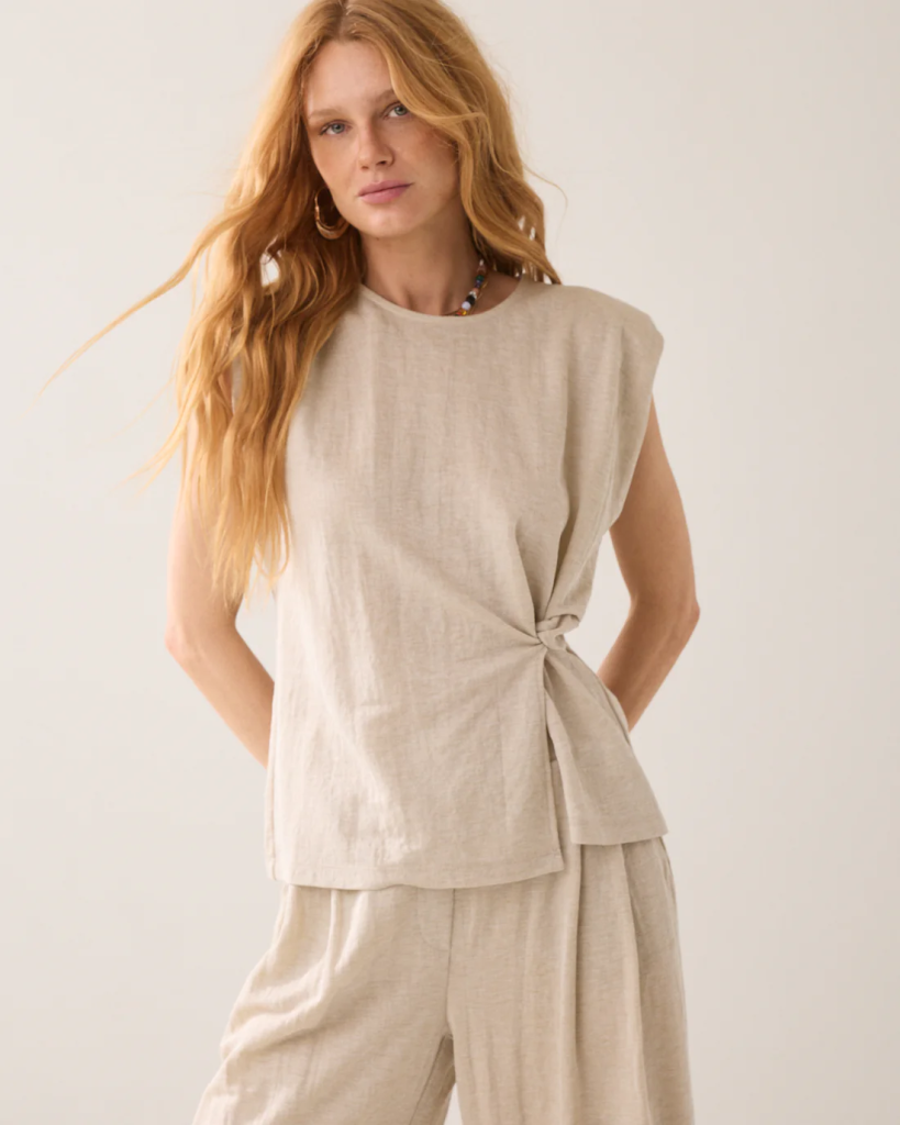 Top in een linnenlook jersey met een gewassen kreukeffect en een luchtig, flowy gevoel. De top valt los en licht getailleerd door het knoopdetail in de taille. Combineer de broek met de bijpassende broek (4S2972).