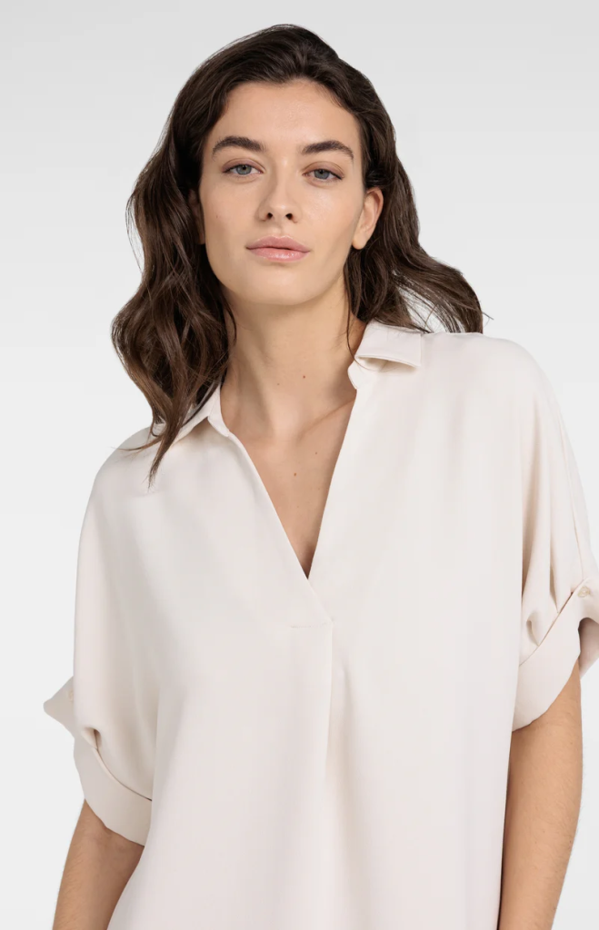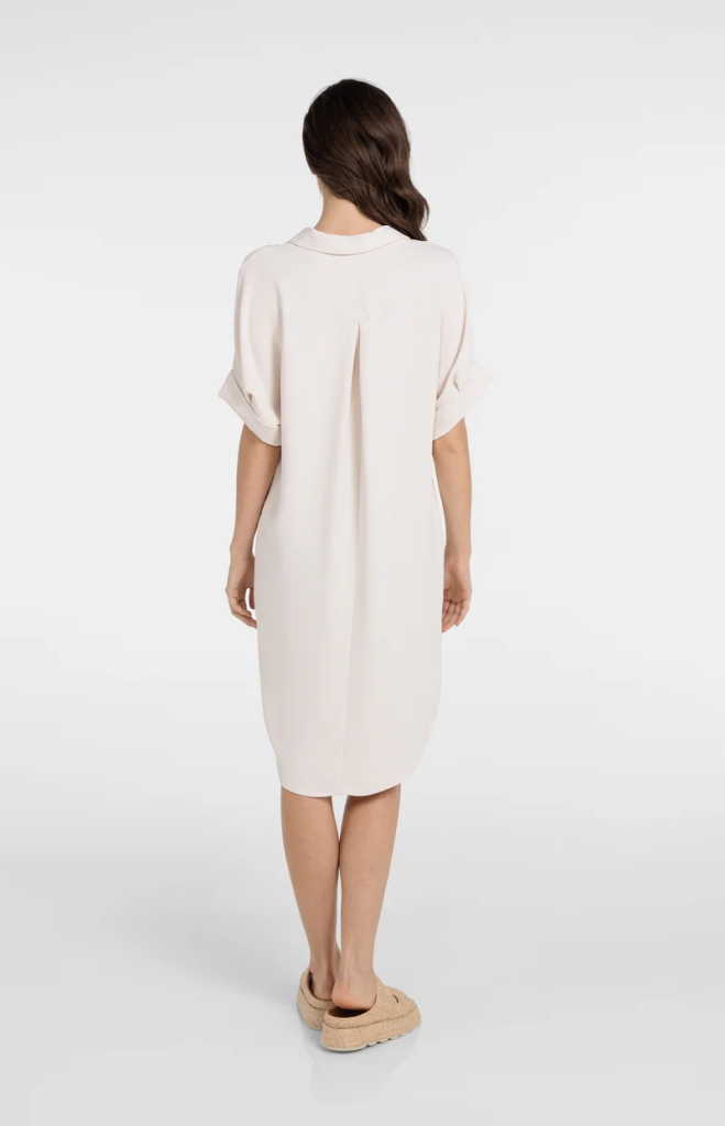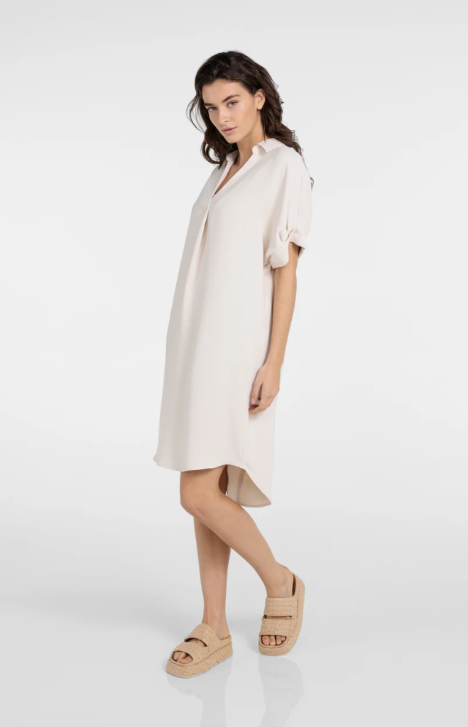 Deze elegante jurk heeft een V-hals, korte mouwen met subtiele plooidetails en een losse pasvorm. Het model valt lang en recht, wat zorgt voor een comfortabele en flatterende uitstraling. De minimalistische afwerking en zachte valling geven de jurk een verfijnde look.